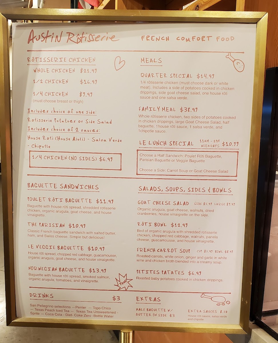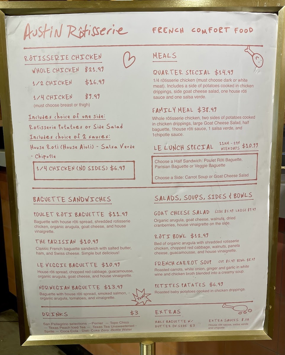 Parisian style whole rotisserie chicken. Includes 2 side sides of potatoes cooked in chicken drippings, 1 large salade de chevre (organic arugula, goat cheese, walnuts, dried cranberries and house vinaigrette), half baguette, 1creamy dijon, 1 salsa verde and 1 chipotle sauce
